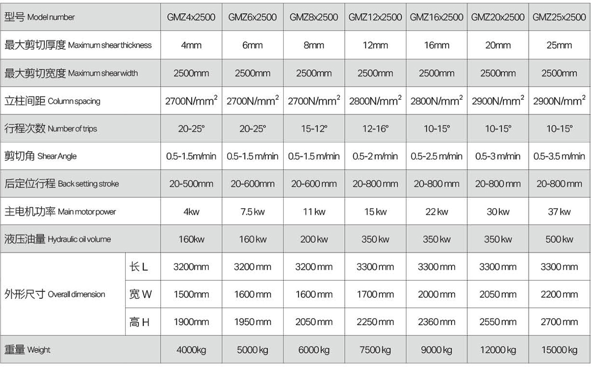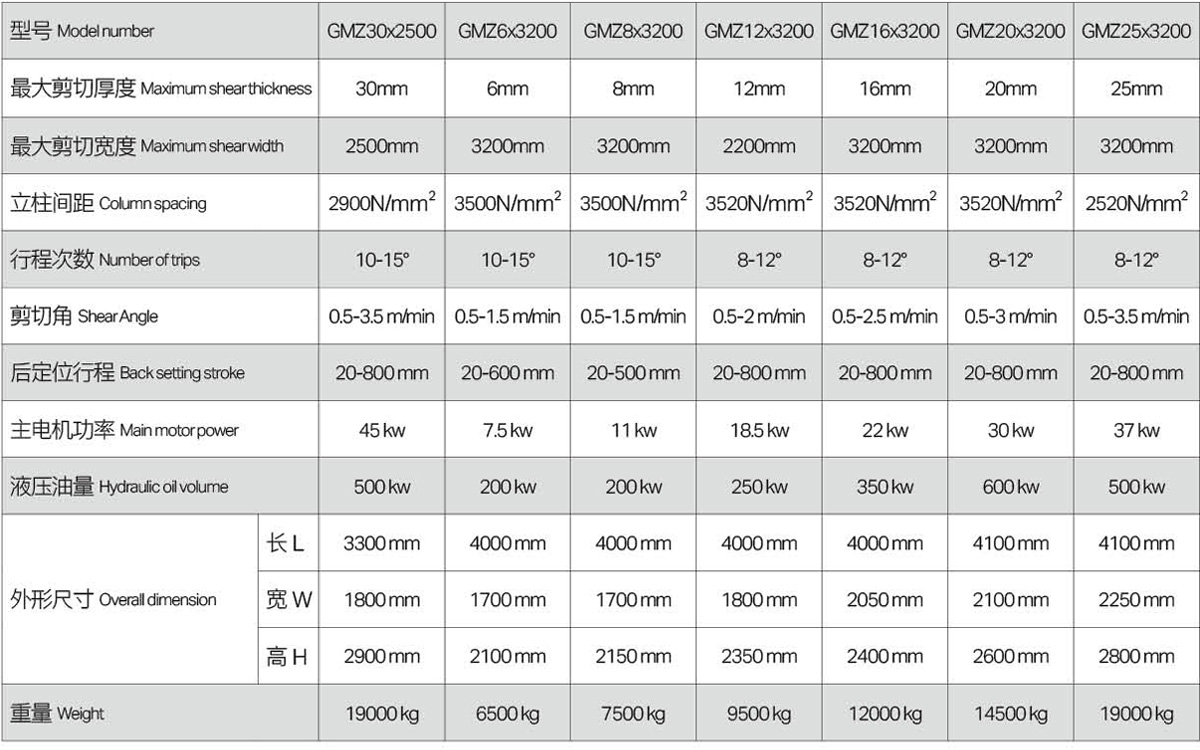 GMZ系列采用全钢焊结构,振动消除内应力,刚性好;采用三点支撑滚动导轨,消除支撑间隙,提高剪切质量;刀片间隙,自动调整,迅速准确方便;配E22数控装置;配国内名牌液压集成系统。